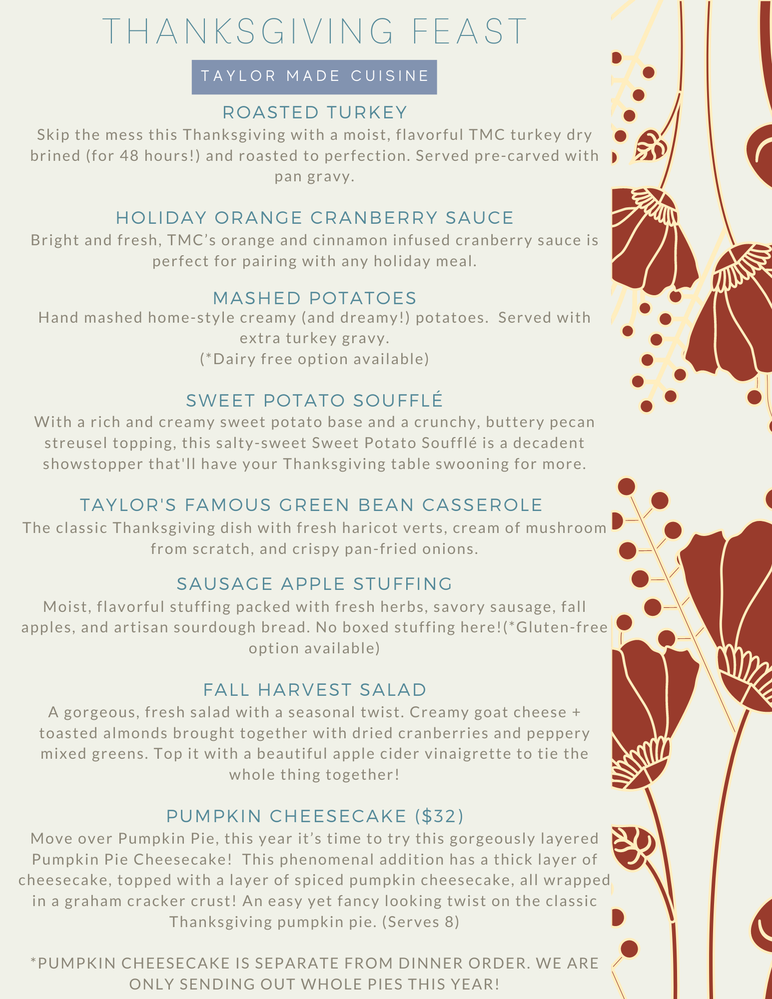 We just released our 2020 Thanksgiving Dinner menu, so you can order a Thanksgiving meal for you and your family!