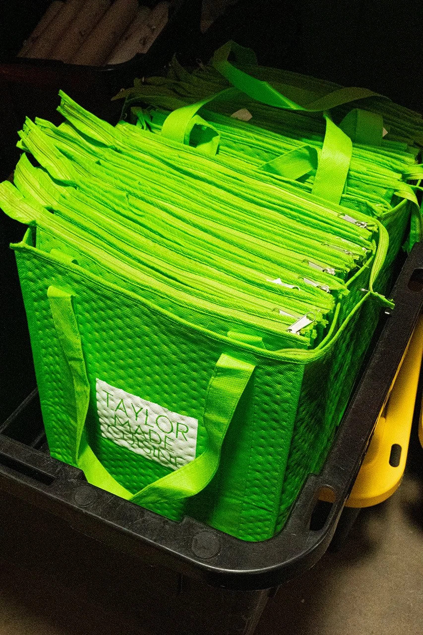 Pictured: Our insulated, reusable bags are cleaned and organized, all ready for Monday deliveries!