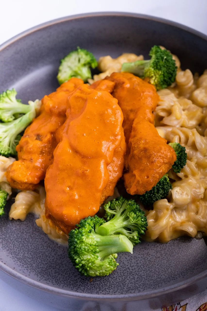 Pictured: Cali-Unfried Chicken + Gluten-Free Mac + Cheese + Broccoli + House Buffalo Sauce