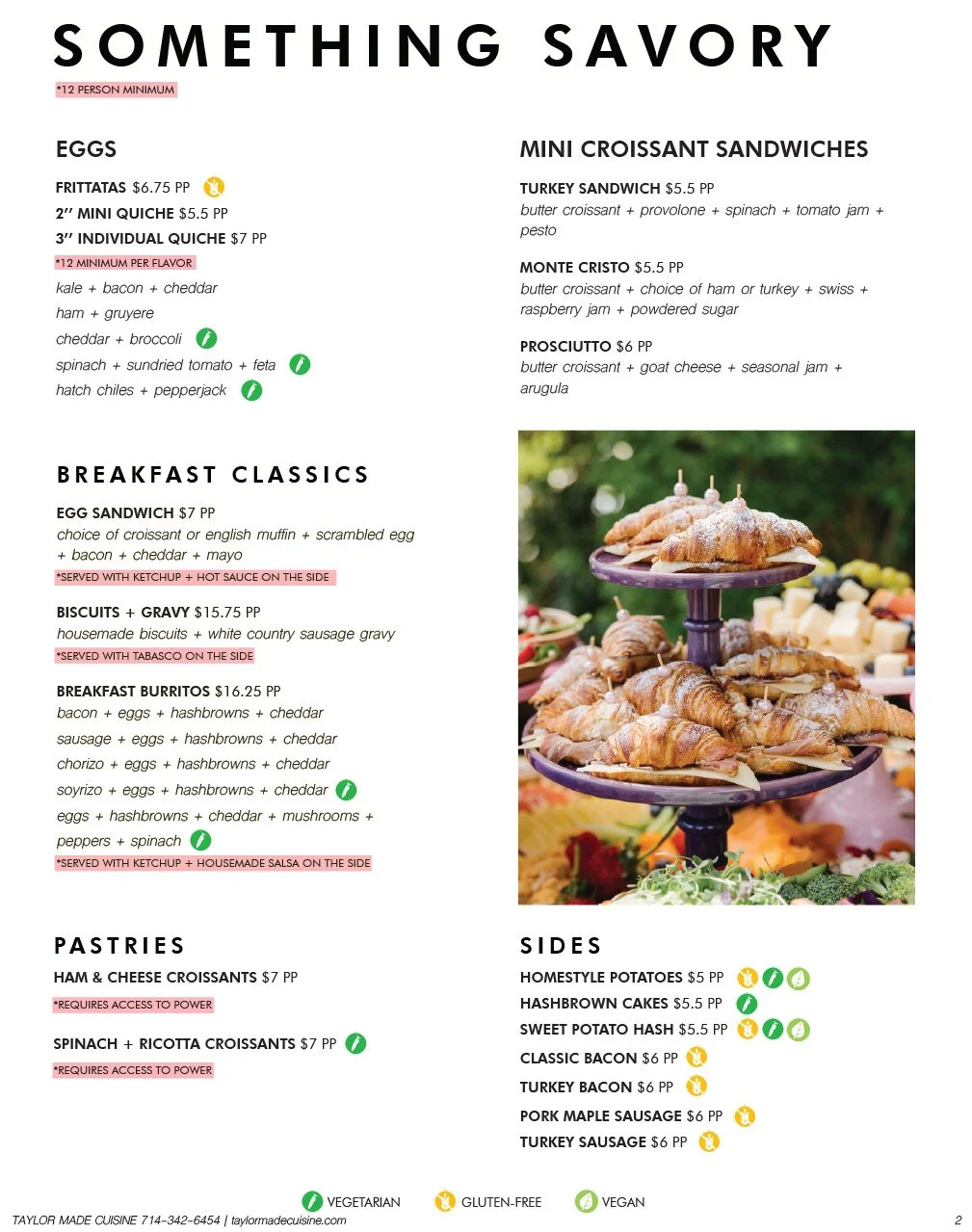 Whether you're planning a morning meeting, a baby shower brunch, or a post- wedding send-off, Taylor Made Cuisine delivers a breakfast & brunch catering experience that’s anything but ordinary. From savory favorites like mini croissant sandwiches, quiches, and frittatas to sweet showstoppers like mini pancake skewers, yogurt parfaits, and pastry platters, our menus are designed to impress your guests.